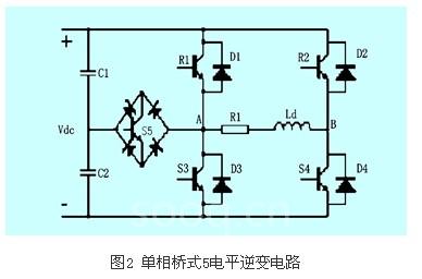 对图1进行改进就可以得到5电平单相桥式逆变电路[17],如图2所示。和图1相比,多了一个电容,使负载输出的电平数为5:vdc,-vdc,0,+vdc/2,-vdc/2。s5截止时其工作同单相全桥逆变电路,可输出三电平;s5和s4(d4)导通时,uab=vdc/2; s5和s2(d2)导通时,uab=-vdc/2。