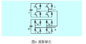 为了输出更多的电平,减少隔离电源数量,每个单元电路结构可以不完全相同,串联单元本身还可以是一个多电平逆变器,如二极管箝位型逆变器,或飞跨电容箝位型逆变器。这种由不同结构单元串联而成的逆变器称为混联型逆变器,如图5(b)所示。如果需要三相,则可以用三组这样的混联单元按照图5(a)所示连接方法相连。实际中,由于级联多电平主要用于高压大功率,为了充分发挥不同类型器件的优点(高压和高频),同一组(相)相串联的不同的逆变单元中常常使用不同的器件,这种连接方式也称为混联,如图6所示,igbt和igct的混联型逆变单元,igbt工作于相对较高的频率,较低的电压;而igct工作于相对较高的电压,较低的频率。