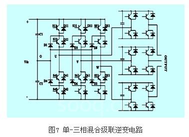 除了上述的联结方式以外,还有由一个三相三电平二极管箝位逆变器或飞跨电容型逆变器和三个单相h桥逆变器串联形成的三相级联逆变器[33][49]。这种电路结构简单,控制也易于实现,实际中已有使用。图7为单-三相混合级联逆变电路图。