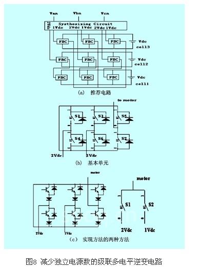 由前述可以看出,级联多电平电路显示了其巨大的优越性,特别是模块化的输出为系统带来很多方便。但是,在具有独立直流电源的级联多电平逆变电路中,其所需独立直流电源数很大,且随着输出电平数及逆变器相数的增加而增加。如果每一个直流电源都需要被控制的话,就使整个系统的控制变得很复杂。因此文献[18]提出了一种合成电路的思想,以期减少直流电源数量。