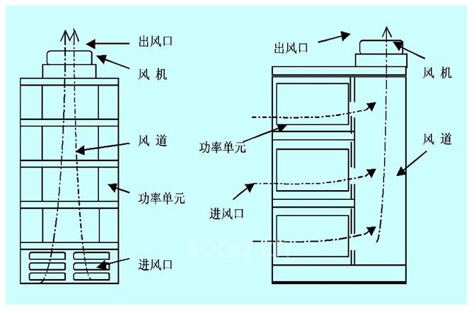 并联风道中从每个功率单元的前面进风,对应的进风口并联排列,在后面的风仓中汇总后由风机抽出,同时整个功率柜一般采用冗余的方法,有多个风机并联运行,整体散热效果好,并提高了设备的可靠性。但柜体后面要形成风仓,增大了设备的体积,同时由于各个功率单元后端到风机的距离不同,使得每个功率单元的风流量不一致,在设计时应加以考虑。