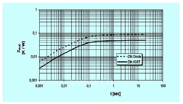 通常处于周期性脉冲功耗负载下的平均和最大结温可以参考厂家所给出的瞬态热阻曲线来计算。如图3示出了eupc型号为bsm400ga120dlc的igbt模块瞬态热阻曲线zthjc=f(t)。