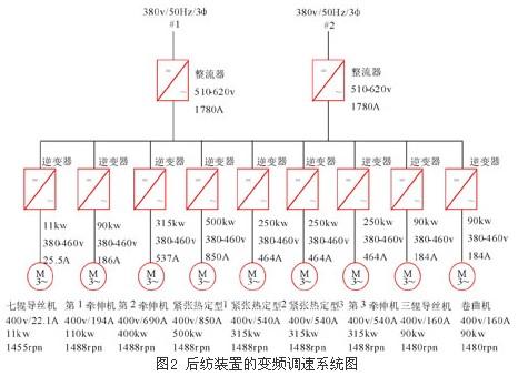 后处理装置中牵伸、紧张热定型、叠丝、卷曲的拖动采用共用直流多逆变器变频调速系统,其逆变器接同一直流母线。电动机则采用大功率的异步电动机。共用直流母线由#1、#2整流装置供电。两套整流器的叠加既可扩大容量,又可减少纹波和谐波,稳定直流电压。与原生产线相比有如下优点:
