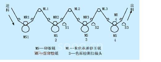 图1为凹版印刷机生产线的印刷过程简图(仅画出前面4个印刷单元)。印刷机由开卷机运行依次经过各印刷单元,进行各色的印刷和烘干,由收卷机进行收卷。每色印刷都会在印料的边缘印上以供套色用的色标,每个相邻颜色的标志线在套印精确时应相互平行,垂直(纵向)相距20mm。图1中,光电扫描头S1检测由1单元和2单元印出的色标。如果相邻两色标间隙不等于20mm,则说明套印出现了偏差,偏差经微处理器进行运算,输出控制信号以驱动执行机构,使相应的套色修正辊ML上下移动来延长或缩短印料上一单元印刷版辊到该单元印刷版辊的行程来动态修正。各单元印刷套色以前一单元印出的色标为基础。
