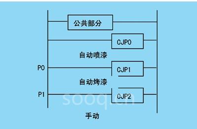 (1)整个程序的自动喷漆和手动喷漆部分,自动烤漆和手动烤漆部分,通过cj指令来分段,如图2所示,大大减轻了编程的难度,使得喷漆,烤漆,自动,手动可分别编程,可以采用双线圈输出,解决了程序包容性问题,注意公共部分程序和分段程序的包容性,防止双线圈输出,否则出现不可预测的结果,通过cj指令可实现任意分段,比采用mc,mcr实现自动和手动更具灵活性,并可以采用双线圈输出。