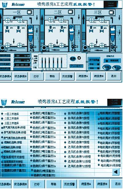 工艺流程画面如图3实现了对整个烤漆房的全面监控,界面形象生动,友好,具有较好的可靠性,在画面上实现凤机旋转动画,燃烧机燃烧动画,当某设备发生故障,该设备将闪烁,并弹出实时报警画面;在手动状态,可以直接点击该设备,便可启停该设备,喷漆和烤漆时,通风的路径及颜色将发生变化。烤漆房温度除数字显示外,采用温度棒图显示。