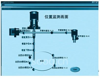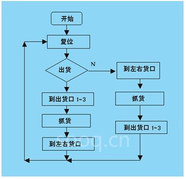 从复位位置启动,根据要求到相应出货台(1,2,3号货台),此时底盘转动到要求位置,立柱下降,手臂伸出,定位后手抓货物,立柱上升,同时手臂回收(以免运行中与其它设备相撞),然后到相应出货台(左,或右出货台),立柱下降,手臂伸出,手打开,把货物放在相应出货台上。