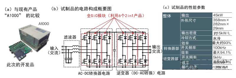 安川电机试制出了与该公司现有产品“A1000”相比,体积只有约1/25的电力转换器(a)。通过在构成电力转换器的转换器电路和逆变器电路上采用全SiC功率模块,并提高开关频率等,实现了小型化(b)。电力转换器整体的输出电力密度约为15kW/L,仅逆变器部为128kW/L(c)。