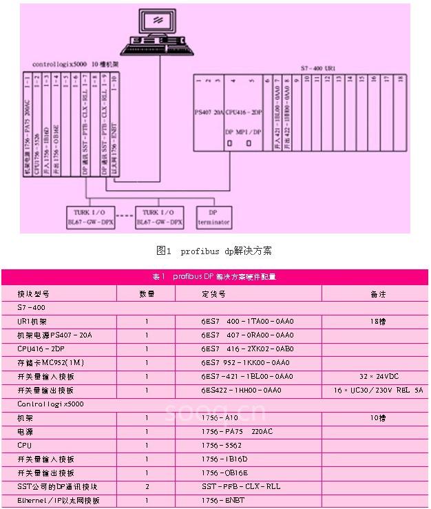 (1) profibus dp解决方案原理与配置设计。profibusdp方案的通讯配置图如图1所示。图中controllogix5000通过第三方sst公司的dp通讯模块sst-pfb-clx-rl做主站,带turk的bl67系列dp远程i/o,然后又通过另一块dp通讯模块做主站,s7-400plc的cpu416做从站,完成了两种类型控制器的dp通讯。做主站的dp通讯模块sst-pfb-clx-r,用sst profibus通讯配置软件完成dp通讯配置。该方案测试需要的硬件配置如表1所示。