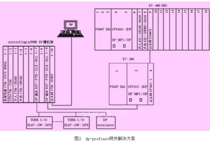 (2)方案评析。这是一个迂回的方案,以一个较低配置的s7-300为跳板,实现了dp-profinet的网关功能,这样两个就近的控制器s7-300和controllogix5000采用成熟的dp通讯,方法与2.1方案相同,同时也解决了dp网通讯距离受限制的问题,而s7-400与s7-300的通讯采用以太网方式,是siemens内部两个不同控制器之间的以太网通讯,其应用层协议都是profinet,技术当然是成熟的,当然其缺点就是通讯配置太繁琐,但如果需要一个controllogix5000控制器与多个s7-400控制器通讯,该方案还是值得考虑的。