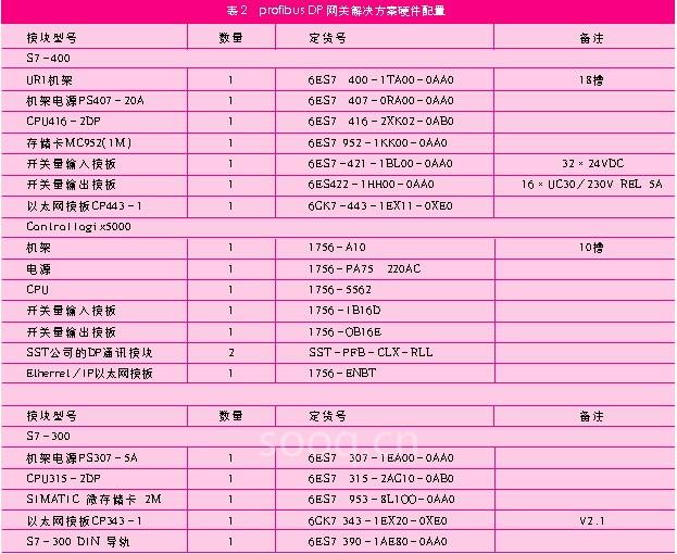 dp网关解决方案原理与配置设计。用一个s7-300plc作为dp-profinet通讯转换用的公共plc,间接实现controllogix5000与s7-400的以太网通讯,如图2所示。该方案测试需要的硬件配置如表2所示。