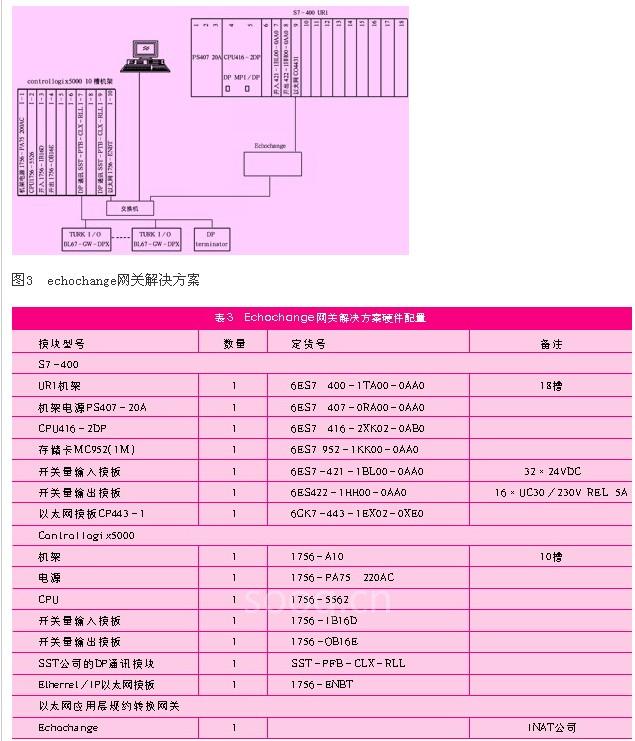 (2) 方案评析。该方案与方案2类似,只不过将网关换成了ethernet/ip到profinet(以前叫industrial ethernet)的echochange,该网关两边都采用的是以太网,只是应用层规约不同,该方案以低的硬件和组态成本,实现了两个已有的以太网网络之间的简易连接,但经过该网关进行的数据交换仅限于整数。与2.1方案相比,该方案省去了一个第三方(sst)的dp通讯模块,且echochange网关的成本比用s7-300搭dp-profinet的网关要低,运行的可靠性高,这也是siemens公司推荐的与ab公司plc控制器的以太网连接方案。