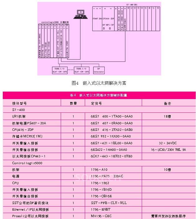 (1)嵌入式以太网解决方案原理与配置设计。嵌入式以太网解决方案采用可插在controllogix5000机架内的prosoft公司生产的以太网模板,自主编程后,直接实现controllogix5000与s7-400的以太网通讯。该方案的通讯配置图如图4所示。该方案测试需要的硬件配置如表4所示。