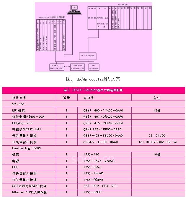 (1) dp/dp coupler解决方案原理与配置设计。在已有dp网上挂dp/dp coupler,采用dp网与s7-400的cpu通讯。该方案的通讯配置图如图5所示。该方案测试需要的硬件配置如表5所示。