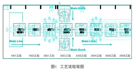汽车的生产制造由四大工序组成:冲压、焊接、涂装和总装。简单来说,冲压工序是完成车身各个部位零部件的加工;焊接工序是完成整个车身零部件的焊接;涂装工序是完成车身的喷涂;总装工序是完成发动机、座椅、汽车控制系统及内饰等的安装。主线和合装工位属于焊接工序,是焊接生产线的重要组成部分。本系统由夹具和电控系统组成。项目简要工艺流程如图1所示。