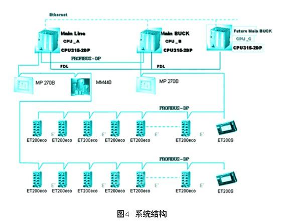 经过缜密思考,最终我们选用了西门子s7-300plc,考虑到系统的扩展以及与其它厂家西门子系统的互联,系统的通讯都采用了profibus,互连采用工业以太网,cpu选用的是315-2dp,通讯模块用的是cp343-1 lean和cp342-5。系统的硬件配置及系统结构如图4所示。