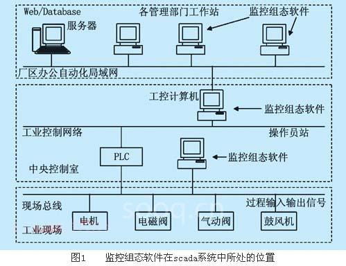在一个自动监控(supervisory control and data acquisitionscada)系统中,投入运行的监控组态软件是系统的数据采集和处理中心、远程监控中心和数据转发中心。处于运行状态的监控组态软件与各种控制、检测设备如挂接在现场总线上的工控计算机、plc、智能仪表、智能设备等共同构成快速响应控制中心。控制方案和算法一般在设备上组态并执行,也可在工控计算机上组态,然后在下装到设备中执行,根据设备的具体要求而定[1]。组态软件在scada系统中所处的位置如图1所示。