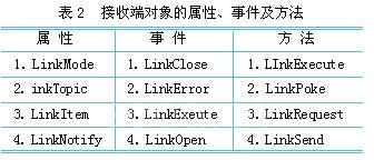 vb中支持dde的对象有5类:窗体(form)、多文档窗体(mdiform)、标签(label)、文本框(textbox)和图片框(picturebox)。其中,窗体和多文档窗体可作为dde服务器即数据的提供者,label、textbox和picturebox等可以作为dde服务器即数据的接收者。vb为支持dde给发送端对象提供了2种dde属性和4种dde事件,给接收端对象提供了4种dde属性、4种dde事件和4种dde方法(见表2)。