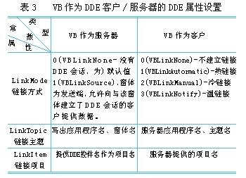 在利用vb开发dde客户/服务器应用程序中,欲建立dde链接,完全依赖对象的dde属性设置。vb分别作为dde客户和dde服务器时,dde属性的不同设置(见表3)。