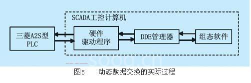 dde管理器作为服务端通过驱动程序从plc的内存中采集到数据,与组态进行数据交换后又通过驱动程序写入plc的内存区,这一过程的示意图如图5所示。