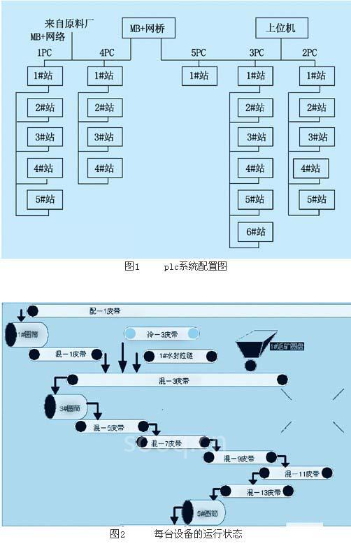 该系统运行的环境比较恶劣,工艺设备中有大量的变频器,粉尘,噪音,震动等。该系统正常工作时处于连锁运行状态,每台设备的运行状态均取决于它的前后设备的运行状态。如图2所示,从3#圆筒到混—13皮带,均受3pc的3#远程站控制,而这段设备的自动启动和停止则由混—3皮带和5#圆筒的状态决定,即混—3皮带启动,则3#圆筒至混—13皮带自动顺序启动—;混3皮带停机,则3#圆筒至混—13皮带顺序停机。