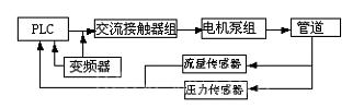 由压力传感器反馈的水压信号(4-20MA或-5V)直接送入PLC的A/D口(可以通过手持编程器),设定给定压力值,PID参数值,并通过PLC计算何以需切换泵的操作完成系统控制,系统参数在实际运行中调整,使系统控制响应趋于完整。