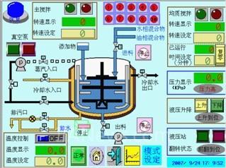 根据系统设计要求,实现油相、水相、主搅拌、均质搅拌电机转速控制,控制范围依次是10rpm~1500rpm、10rpm~1500rpm、10rpm~80rpm、100rpm~4500rpm;实现油相锅、水相锅、乳化锅温度的智能控制,控制量范围依次是:0~100℃、0~140℃、20~140℃;实现乳化压力控制,控制范围为-100Kpa~+100Kpa和液压升降控制。