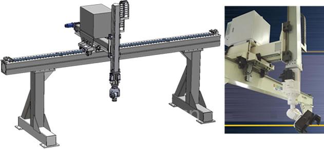 直角坐标型的龙门框架结构,承载能力强,可无限扩展,稳定可靠,造价相对低很多。抓取物体的能力主要受三个末端旋转轴的限制。目前配合手爪后可以抓取的物体重量是:50公斤,100公斤和200公斤三种型号。