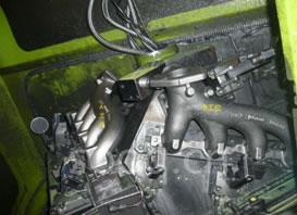 图4:左上图表示从工装A上抓住排气管。右上图表示把排气管取下后升高及转动。左下图表示排气管被调整到与工装B要求的方向。右下图表示把排气管按55.8度方向装到工装B上。