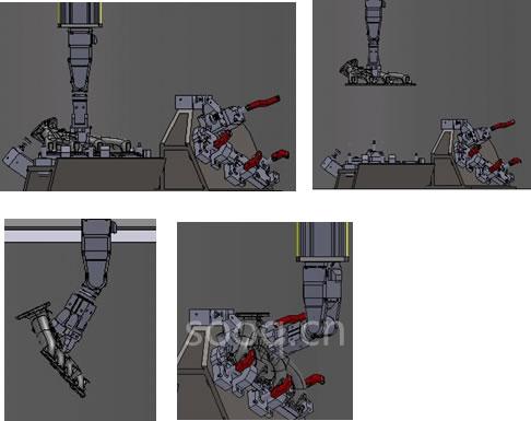 本项目中最大的难点之一是如何把工装A上的排气管取下,经A轴和C轴的各自转动及B轴的摆动后装到工装B上。这里还有考虑机床内部空间对手爪运动轨迹及空间的限制。