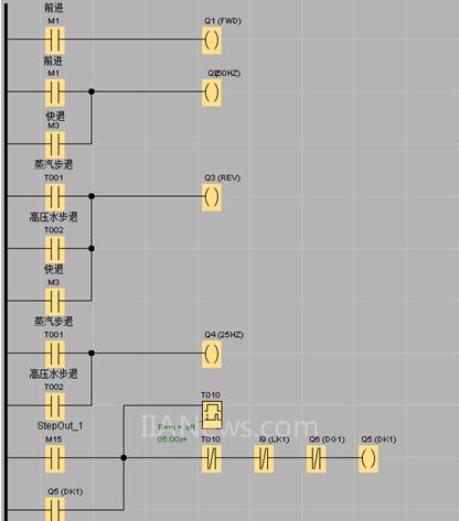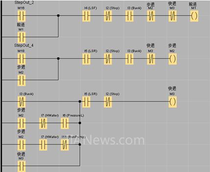 本设备程序采用 LOGO! 所支持的梯形图语言编写,根据工艺需求,设备运动方式分为:前进、步退、快退 三种。
