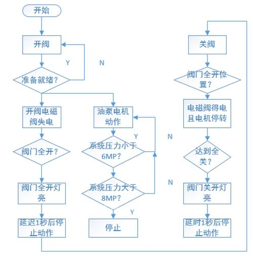 首先检查各行程开关输入点是否正确(阀门全关行程开关到位),当阀门处于全关位置,按开阀按钮则会进入开阀动作状态,在阀门开启过程中,主阀开启灯会闪烁,并且会有相应文本显示,当开启完成后主阀开启灯常亮;关阀过程为:当阀门处于全开位置时按关闭阀门有效,则阀门会进入关闭过程中,在关阀过程中,主阀关闭灯会闪烁,并且会有相应的文本显示。主阀全关时,按关阀按钮无效;同样,主阀全开时,按开阀按钮无效。