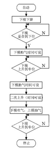 成型机动作过程:自动---下模下降(下位)---下模抽气---下模上升---中位脱水(中位)—下模上升---上模抽气,下模吹气(上位)----下模下降-----上模吹气