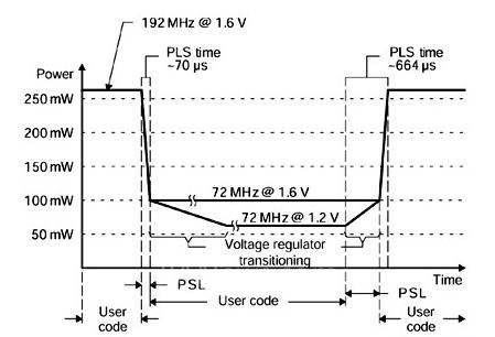 下面图2显示了设置点是如何控制V/F调节的时序的。由于电压和频率调节对设计中所用的DSP和电压调节器是特定的,PM API支持设置点延迟查询和配置,同时PM库可被重建。