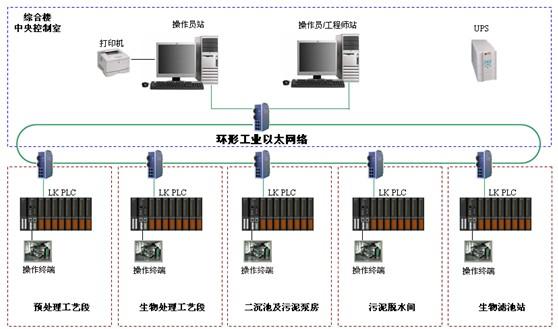 整个系统设1个中央控制室、4个现场PLC控制站组成。现场PLC控制站,由可编程序控制器(PLC)系统及检测仪表组成,对污水处理厂各工艺过程进行分散控制;再由中央控制室(CCR),对全厂实行集中管理。中央控制室、PLC控制站之间的数据通讯采用高速的、实时的工业以太网,网络结构为环形,通讯速率为100Mbps,传输介质为光纤。系统整体性能具有如下特点: