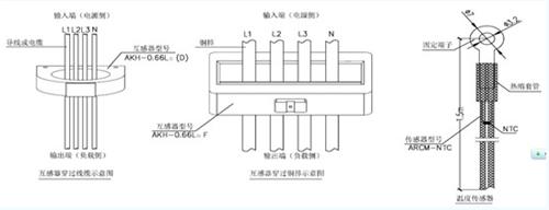 3)剩余电流和温度传感器穿线示意图。剩余电流互感器的额定电流等级,应大于或等于配电回路保护电器的整定电流值,实际应用中应确保所有线缆或铜排穿过互感器;.温度传感器为一热敏电阻NTC,它提供-10℃-120℃的温度监控基准,可以用来监测线缆或配电箱内的温度,提供温度保护,如图4所示