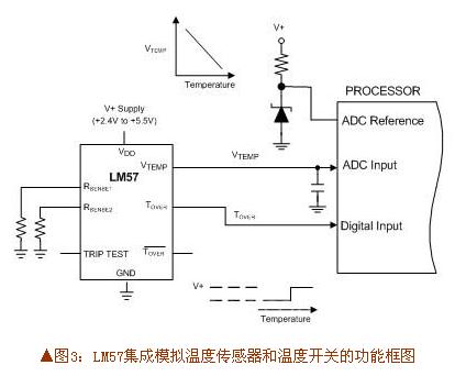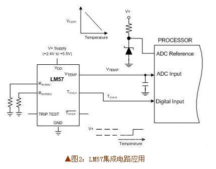 LM57不仅集成了分立热敏电阻电路的功能,还改进了其性能。如图2所示,我们可以看到元件数量变少了,但功能却增加了。例如低态跳脱点输出和输入针脚使系统可以在原位置测试LM57的功能。