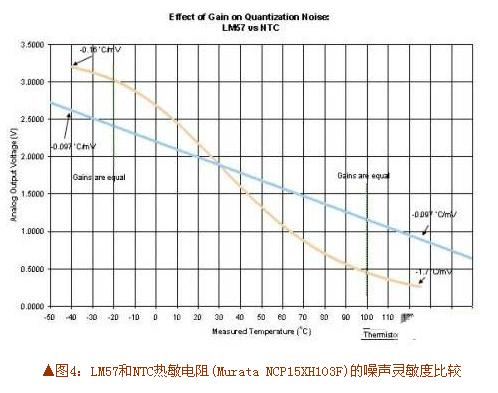 那么,此噪声在温度误差中意味着什么?答案取决于传感器输出的增益。传感器的增益幅度越大,就越少受到噪声的影响——传感器增益越高,量化噪声产生的误差越小。如图4所示,可以看到在跳脱温度设为100℃时,LM57的VTEMP模拟输出与-10.4mV/℃典型增益值呈现很好的线性关系(实际上,LM57具有4种可能的增益,这取决于选择的跳脱点值,但是本例中我们选择100℃)。这表示每毫伏噪声对温度的影响为0.097℃/mV。同样在100℃的温度下,热敏电阻输出端的1mV噪声将产生1.7℃的误差(本模拟试验中使用NCP15XH103热敏电阻和6.2kΩ偏压电阻器)。