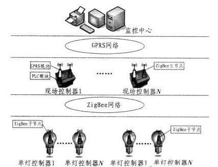 由PLC独立控制模块、GPRS通信模块、ZigBee无线通信模块等组成,完成数据采集、控制输出、数据通信、故障报警等功能。现场控制器通过GPRS与照明管理监控中心服务器相连,通过ZigBee无线通信模块与单灯控制器相连,以此实现实时通信,如图2所示。