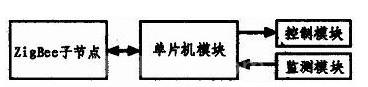 每盏路灯都装有单灯控制器,由ZigBee无线通信模块、完成电量采集和模块遥信功能的单片机模块组成。ZigBee无线模块具有网状拓扑结构,这样ZigBee子网就有内置冗余保证,如果网络中有节点脱离网络,无法工作,节点数据将自动路由到一个替换节点保证系统的可靠、稳定。单灯控制器是路灯监控系统中控制功能的执行部分,控制路灯的状态并监测路灯运行的电流、电压、功率因素等,将这些参数通过无线方式传送到现场控制器,同时接收来自现场控制器的所有控制指令,从而实现远程控制功能,如图3所示。