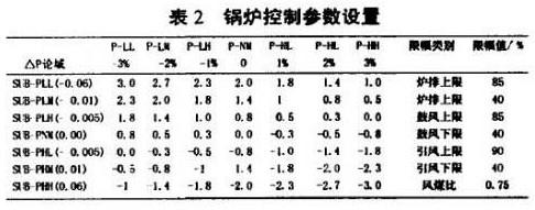 。常规的P、I、D调节跟随性较差,无法完成这样一个大滞后系统的自动调节。采用基于模糊理论的专家系统[l],可较好地实现对锅炉燃烧系统的自动控制。表2是基于专家系统的控制参数规则表。其中P论域表示模糊控制中锅炉压力的论域,AP论域表示两个运行周期锅炉压力变化差的论域。