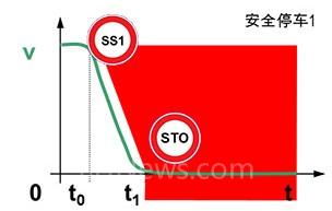 当安全编码器被检测到失效,或者系统设计为具有SS1的功能并被高一级的控制器激活SS1,对于SS1而言,其速度斜坡曲线可以被预先配置,系统监控其速度的下降,当下降至所设定的速度时即STO-切出扭矩,使得机器停车,应用时必须考虑到斜坡到达时的制动距离是否被计算为安全。