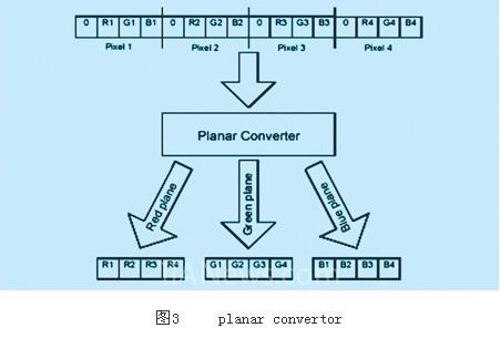planar convertor能从以4位表示的彩色象素值中将r、g、b分量提取出来,然后在pci传输时分别送到主机内存中三个独立的buffer中,这样可以方便在后续的处理中对彩色信息的存取。在有些采集卡(如pc2vision)中,它也可用于在三个黑白相机同步采集时将它们各自的象素值存于主机中三个独立的buffer中。