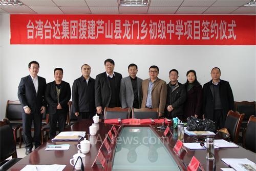 2013年“4•20雅安地震”后,台达集团承诺捐赠人民币1,000万元,为灾区学生打造一座以环保节能为概念的绿色建筑校园,此援助项目“芦山县龙门乡台达阳光初级中学”签约仪式于今(20)日在芦山县行政中心隆重举行。四川省慈善总会办公室主任梁军、芦山县政府办党组成员、外侨台办主任戴雅萍、芦山县教育局局长李子发与台达中国区行政副总裁曾纪坚代表参加援建协议签约仪式。同时,芦山县教育局也正式委托中国建筑设计研究院为项目提供设计支持,共同在协助灾区重建的同时推广绿色建筑与可持续发展的理念。学校建成后,将申请国内绿建筑二星标章。