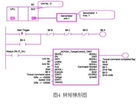 程序结构非常简单,采用欧姆龙内置fb(程序功能快)可以很快的完成相关编程,在输入输出写好所需要得参数例如转矩,钳制速度,轴节点号等即可,图4列出了转矩控制程序的fb。