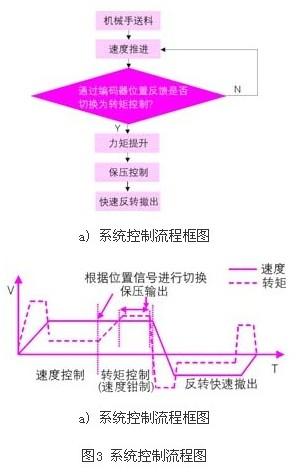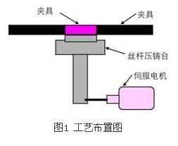 高压和高速是压力铸造工艺的二大特征,铸件充型完好,轮廓清晰主要取决于压铸速度(即压铸过程),而铸件的内部质量和机械性能主要取决于增压效果(即增压过程),要想获得高质量的压铸件,必须根据不同的情况对压铸过程中的所有工艺参数如压力和压铸速度等进行恰到好处的控制,因此在压铸过程前段,采用速度控制,后段采用转矩控制,进行增压与保压,在速度与转矩切换时候,工艺上希望要求达到“零切换时间”,即没有死区时间,同时增压过程中,转矩输出线性度高,转矩控制精度达到0.01nm,工艺布置图如图1所示。