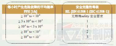 在IEC61508和ISO13849-1标准中,描述了安全功能允许的最大失效概率—每小时危险失效的平均概概率 PFHD。该值越小,则安全等级越高。每小时产生危险故障的平均概率