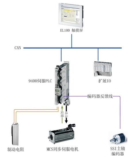 9400伺服PLC驱动器通过集成的CAN接口与触摸屏进行通讯,扩展IO接口通过CAN总线与9400伺服PLC相连。