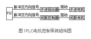 PLC电机控制系统所用的电机基本是步进电机和伺服电机这两种。这两种电机都属于控制电机,它们的动作取决于控制信号,需要步进驱动器和伺服控制器来接受控制信号并将控制信号进行适当转换来驱动电机[2]。因此,PLC产生的控制信号是实现控制的关键。这里的控制信号包括脉冲和方向信号等。PLC电机控制系统结构如图1所示。