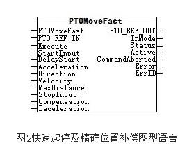 以快速起停及精确位置补偿为例,此功能块由外部数字量信号触发,恒定频率持续输出脉冲。启动信号触发后频率由0开始根据设定的加速度增加到目标频率。停止信号触发后,功能块开始输出位置补偿值,并根据设定的减速度在输出完位置补偿值时减速到0。PTO_REF_IN是对PTO的参考输入。Execute是上升沿使能输入。StartInput是外部启动输入。DelayStart是运动执行延迟。Acceleration是加速度值。Direction是运动方向。Velocity是目标速度。MaxDistance是运动执行的最大保护距离。StopInput是外部停止输入。Compensation是位置补偿脉冲值。Deceleration是减速度值。PTO_REF_OUT是对PTO的参考输出。InMode是外部输入触发允许。Status是运动状态。Active是外部输入触发执行状态。CommendAborted是执行请求忽略。Error是监测错误。ErrID是错误类型。其图形语言如图2所示。